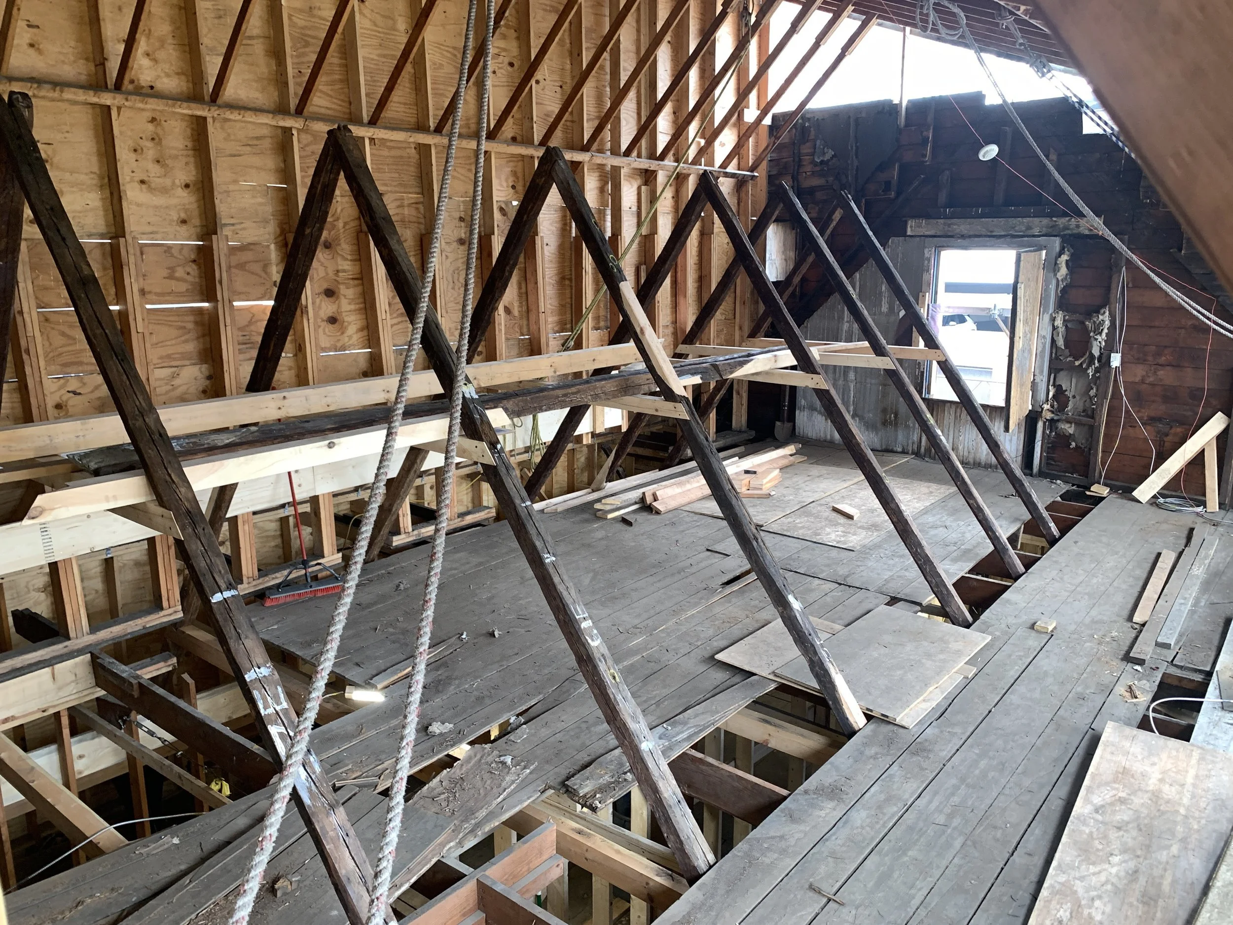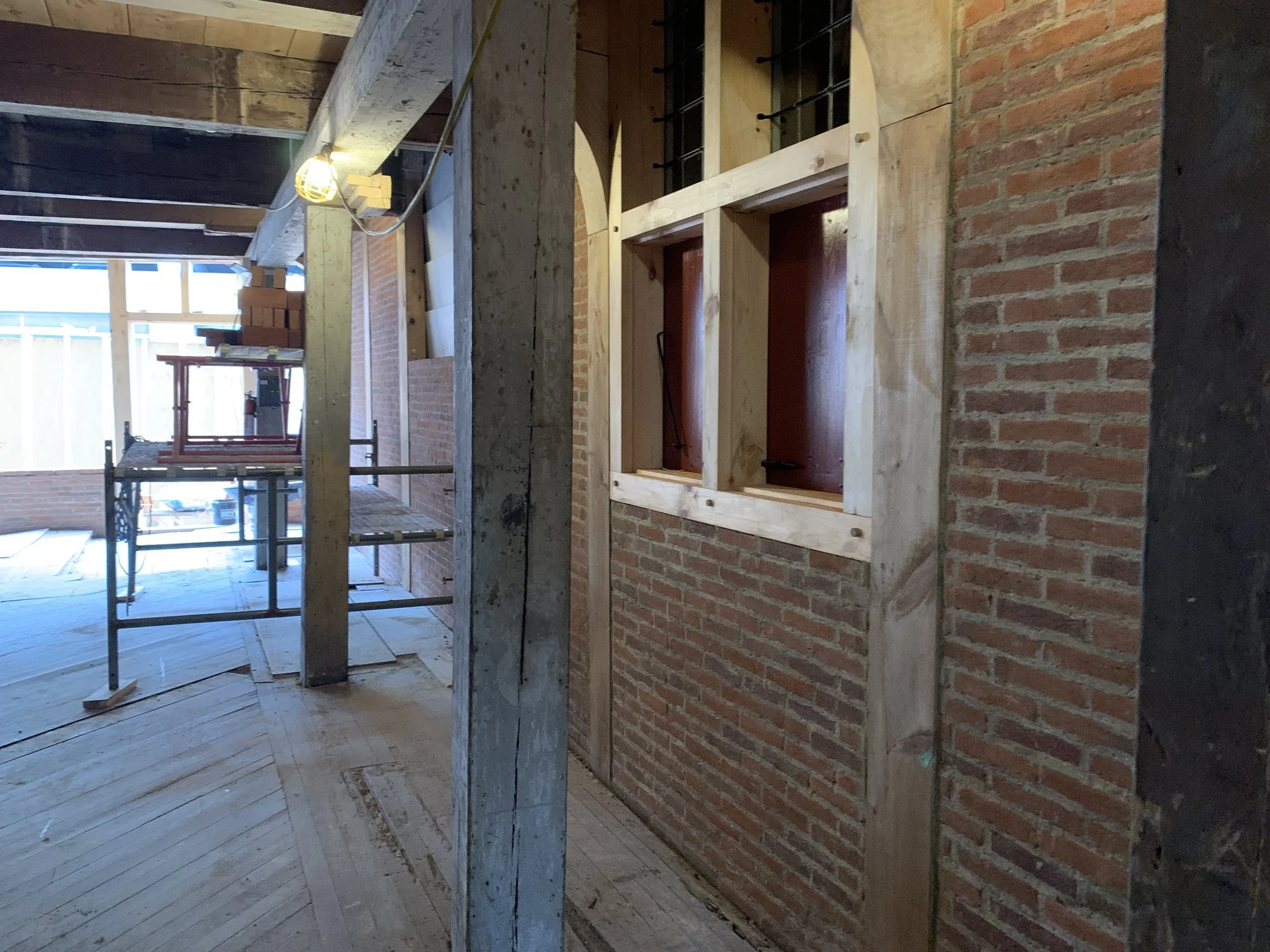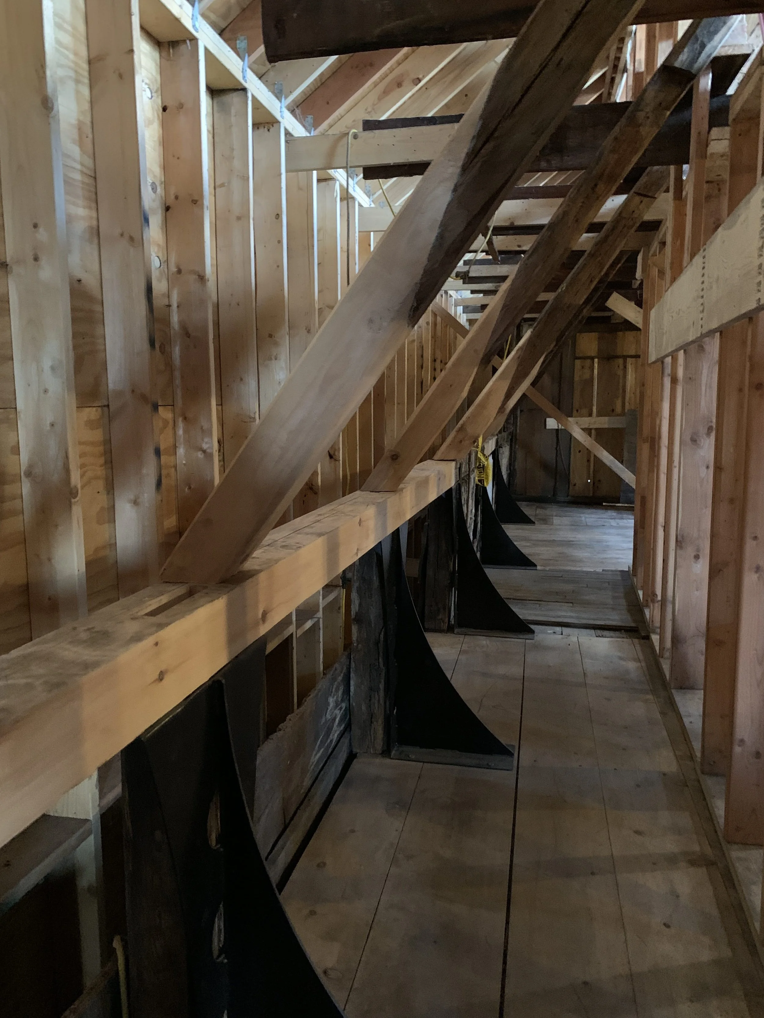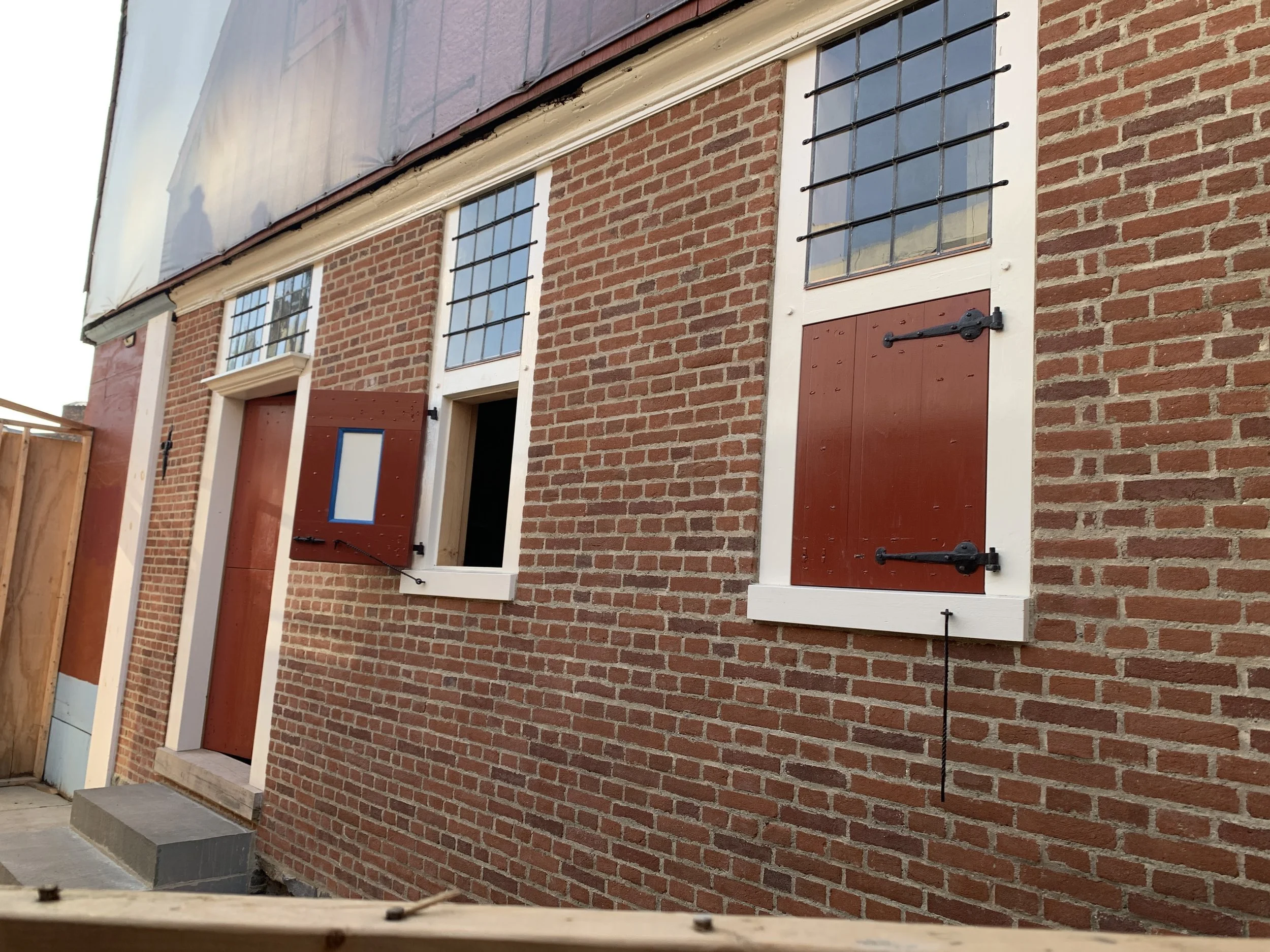 Once the plan was formed, HAF immediately began fundraising and in 2016 received its first grant to begin stabilization work on the Dutch House. The Consulate of the Kingdom of the Netherlands provided a grant to put a decorative scrim on the front of the building depicting what it would look like when completed to raise awareness for the project. It worked! The NYS Office of Parks, Recreation and Historic Preservation provided a grant to reinstall two new foundation walls (they had been removed in an earlier expansion), and restore the H-bent timber framing structural system. This phase was completed in 2021.