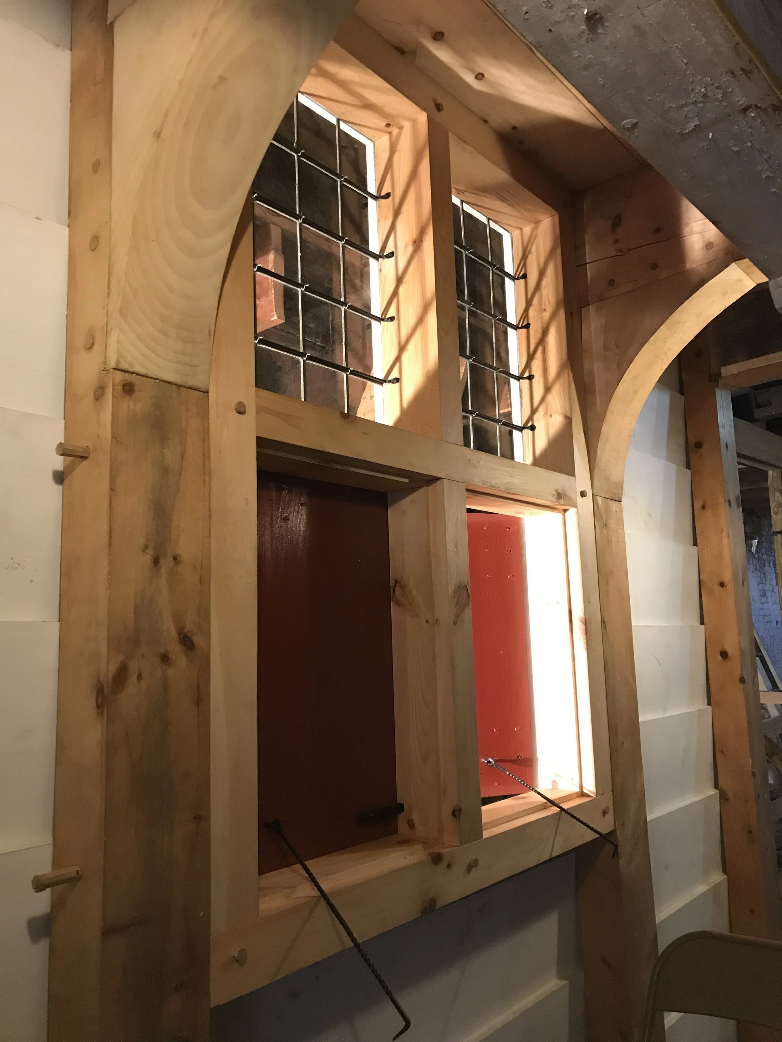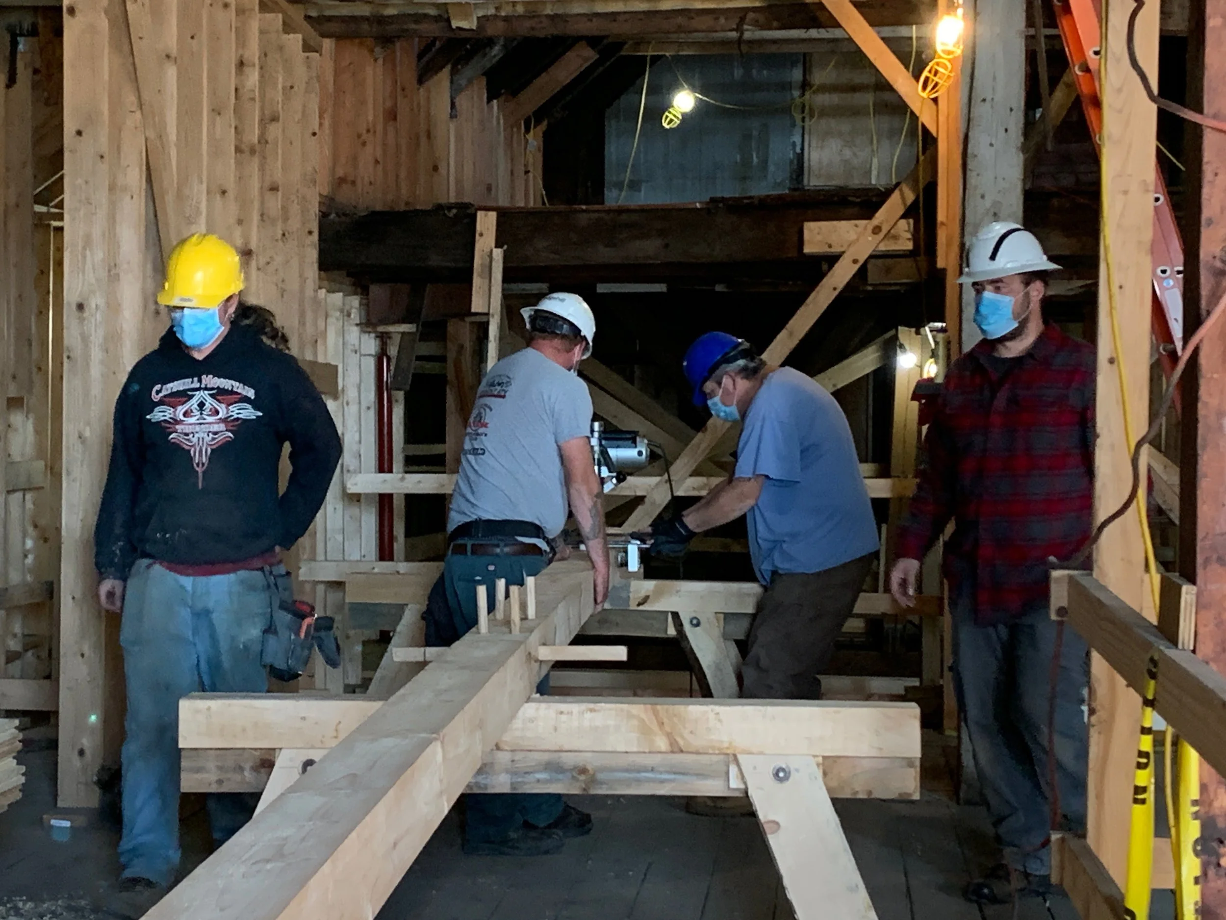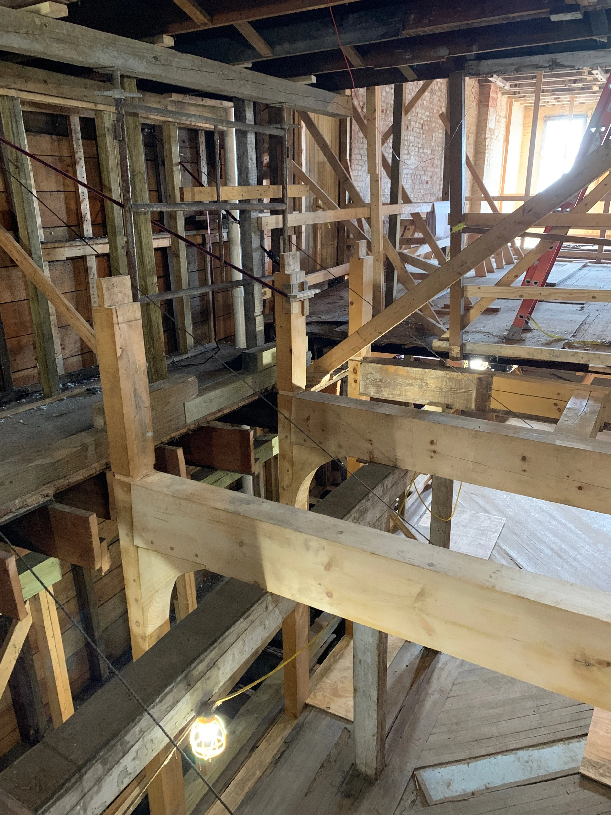 Once the plan was formed, HAF immediately began fundraising and in 2016 received its first grant to begin stabilization work on the Dutch House. The Consulate of the Kingdom of the Netherlands provided a grant to put a decorative scrim on the front of the building depicting what it would look like when completed to raise awareness for the project. It worked! The NYS Office of Parks, Recreation and Historic Preservation provided a grant to reinstall two new foundation walls (they had been removed in an earlier expansion), and restore the H-bent timber framing structural system. This phase was completed in 2021.