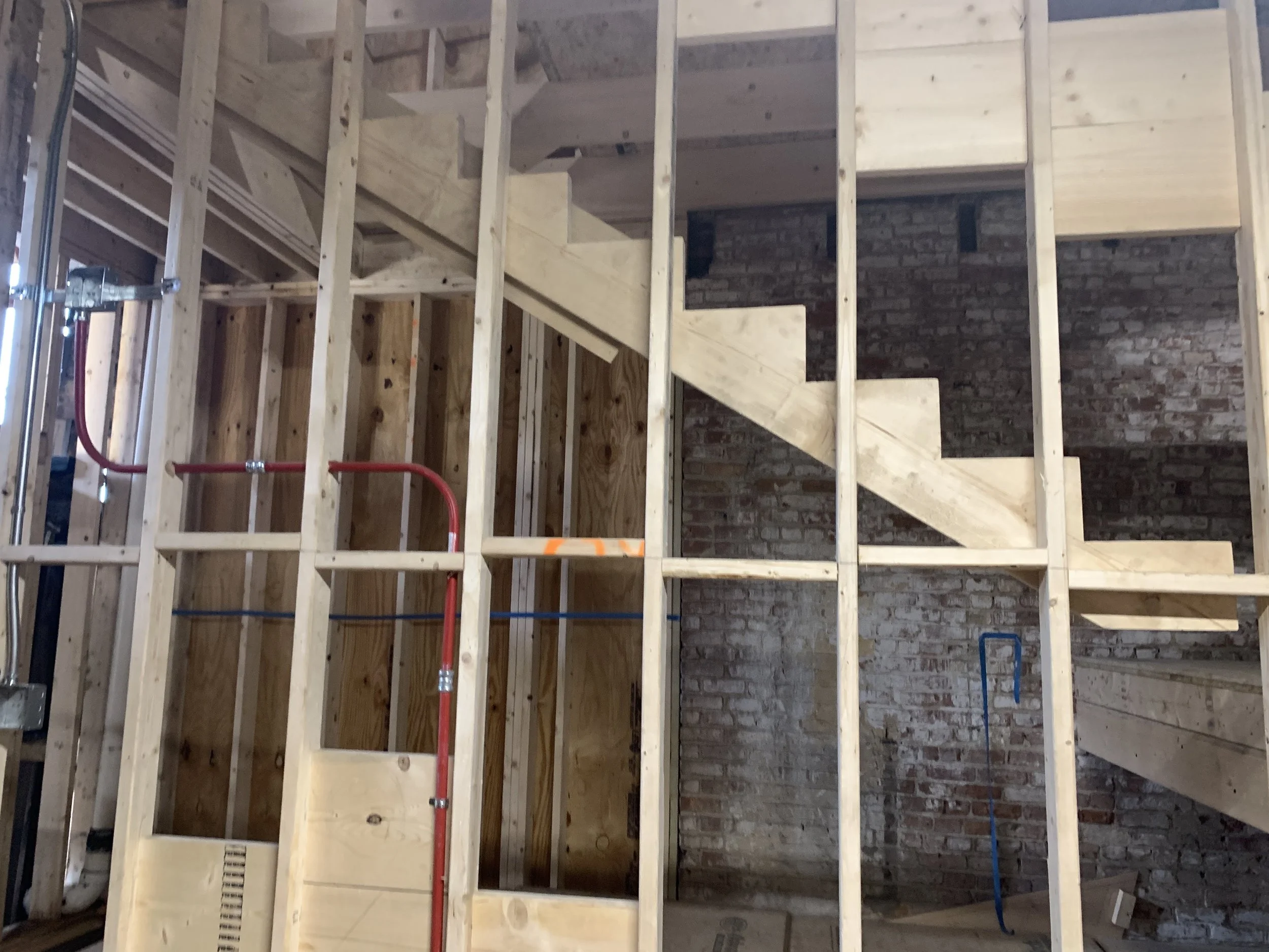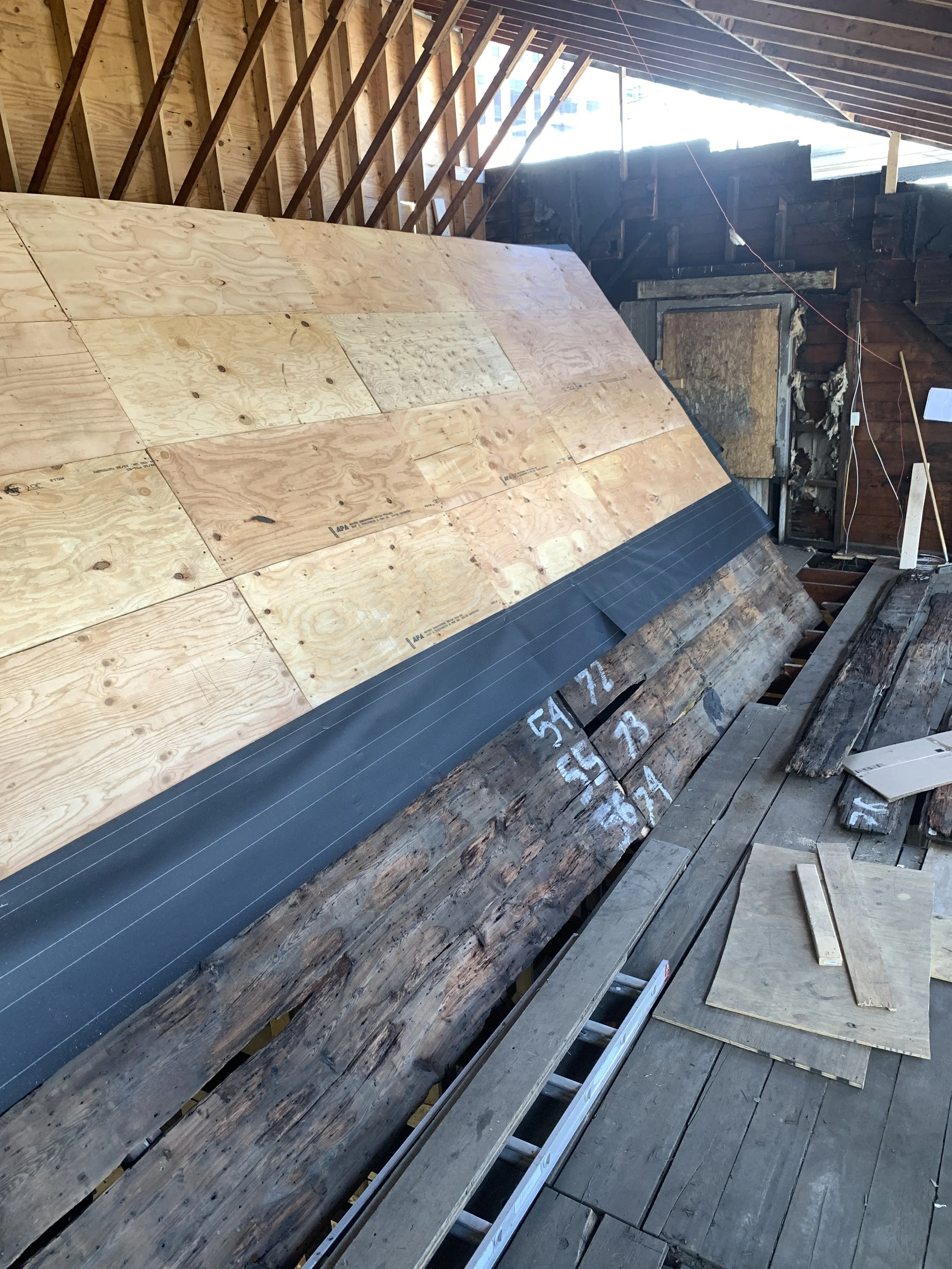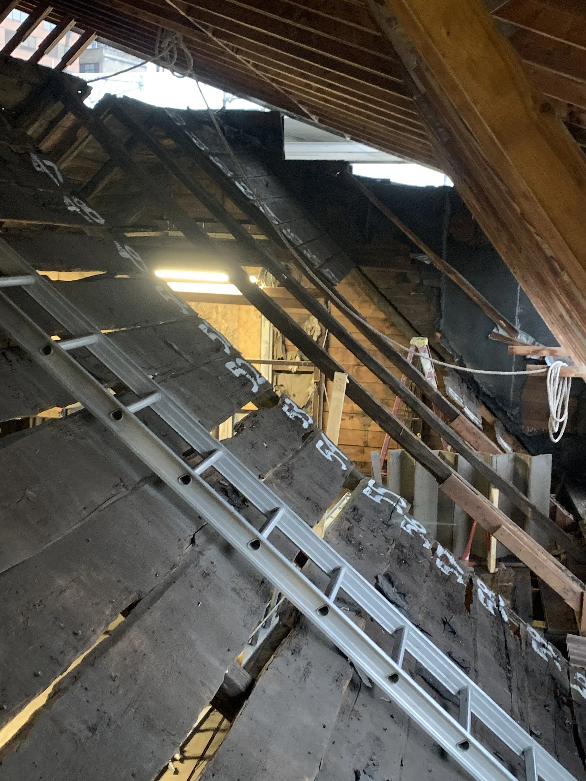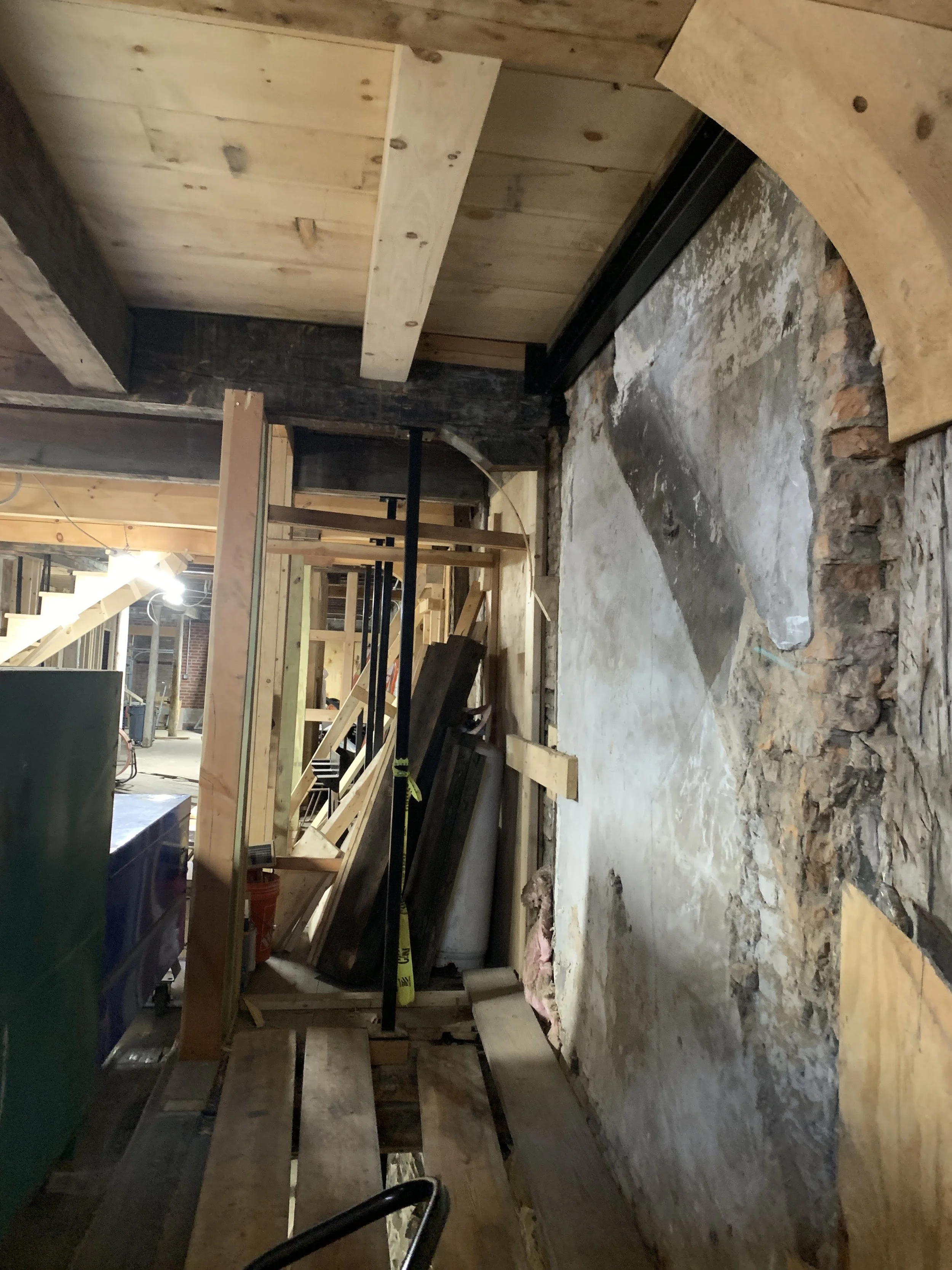 At the Van Ostrande-Radliff House, HAF’s committee/taskforce first acknowledged that each section of the building (the Dutch House, the Warehouse addition, and the garage) each had significance in its own right and deserved its own specific treatment as together the building as a whole tells the story of Albany’s development from a Dutch colony to present day. The approach developed was “simple.” As the Dutch House is so rare, it would be restored on the exterior with two exterior walls being carefully reconstructed based on physical evidence. On the inside, Dutch House would be preserved. The Warehouse addition would be rehabilitated as it had suffered the greatest damage from decades of roof leaks, . The most damaged portion of the Warehouse addition would be the location of the majority of the modern intervention. It would have the stairs, restrooms, elevator, and mechanicals. The Garage would also be rehabilitated and receive the least intervention, namely a code compliant ramp to access the Warehouse addition.